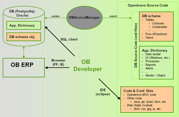 Openbravo developers have three different ways to develop their code. Following the MDD approach, most common is to edit Openbravo Application dictionary through a web browser connected to Openbravo ERP. Based on the new model definition the software artifacts can be generated automatically. A developer can also connect directly to the Openbravo database through a sql client (eg. pgAdmin, sqlDeveloper) to manage database schema objects (tables, procedures, etc.). Finally developers can develop their own code through an integrated development environment such as Eclipse.